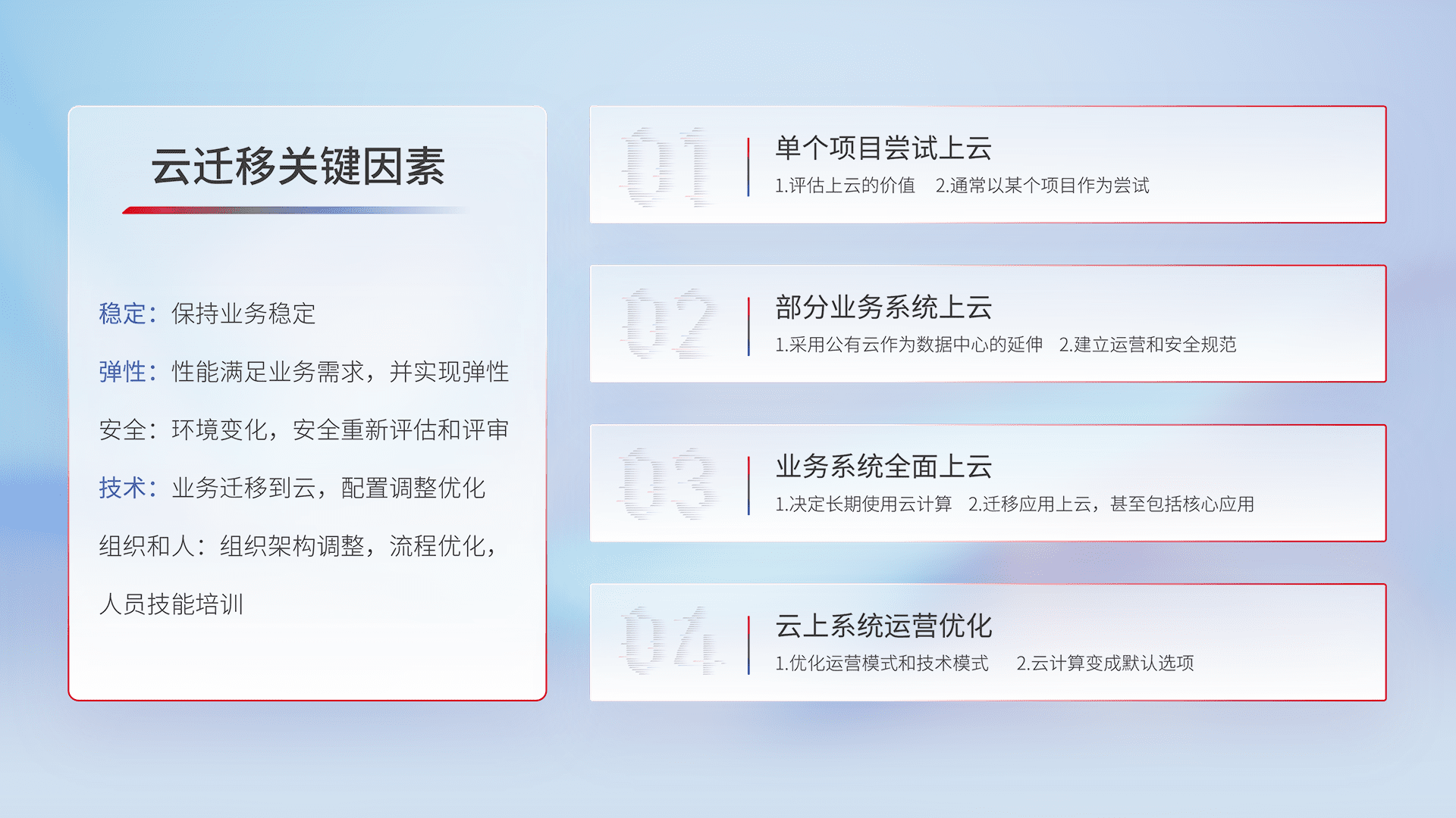 结合实际业务,,,,从规划设计、、云平台选型、、、、云原生改造、、数据迁移、、、、集成交付,,,迁移全过程为客户识别最佳上云路径,,,,做好风险识别管理,,,设计网络架构、、身份权限、、、安全审计合规、、、、操作审计、、、、日志审计、、、监控告警策略、、、、多站点容灾设计等,,,对云上基础设施进行整体规划,,提升IT治理水平,,,以满足弹性、、高可用、、高性能的需求。。